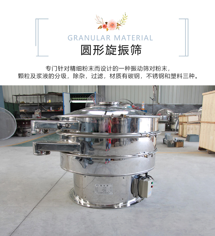 圓形旋振篩就是指篩機外觀為圓形的振動篩,也叫旋振篩,是專門針對精細粉末而設計的一種振動篩,適合對粉末,顆粒及漿液的分級,除雜,過濾,材質有碳鋼,不銹鋼和塑料三種。不同的材質針對不同的物料篩分。