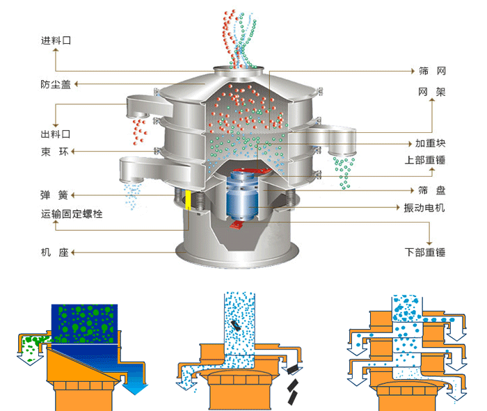 圓形旋振篩是由直立電機作為激振源,電機上,下兩端安裝偏心重錘,將電機的旋轉運動轉變?yōu)樗剑怪?,傾斜的三次元運動,再把這個運動傳遞給篩面進行篩分。